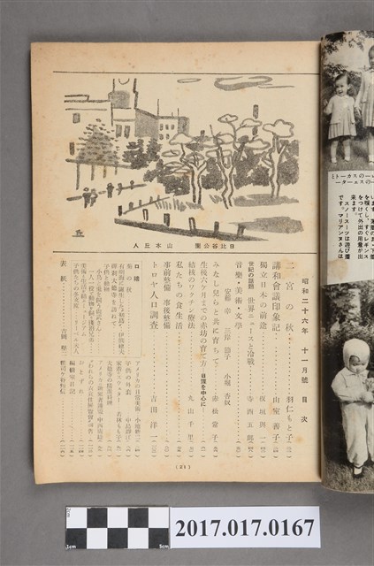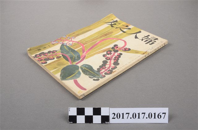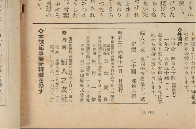 本物件為婦人之友社發行之《婦人之友》第45卷第11號,內容為:二宮の秋/羽仁とも子、講和會議印象記/山室善子、獨立日本の前途/板垣與一、世紀の話題 世界ニュースと冷戰/寺西五郎、音樂美術???、のなやみに答えて/羽仁說子、?????、生後六ケ月までの赤坊の育て方日課を中心に、結核のワクチン療法/丸山千里、私達の食生活、事前整備事後整備、トロヤ人口調査/吉田洋一、口繪、アメリカの日常美術/小池新二、家着スウェター/若林子、大徳寺の精進料理、アメリカ新来者連盟/中西康雄、子供の外套/中島静江、われらの衣食住展覽會報告、おとずれ、編輯室日記、雜司ヶ谷短信。日本大正末期至昭和初期,由於關東大地震連帶使社會不景氣,出版社開始流行出版円本(類似專題書籍,常見命名為xx全集稱之)與文庫書(以A6為尺寸的書),除了一般書籍的編印外,為了及時反映社會訊息雜誌遂逐漸流行,譬如1932年日本圖謀建立滿州國時,日本國內就出現許多評論當時中國大陸的相關消息,1937年由於蘆溝橋事變,日本為了確保軍事物資,遂進行經濟統制,日本出版界便以情報宣傳機關管理國家力量開始介入,1938年甚至公告兒童雜誌字數限制、附錄廢止等政策,隨著戰事緊張,一些較無戰爭宣傳的雜誌被統合廢止,兒童或婦人雜誌也無法倖免,戰後,雜誌出版才得以逐一恢復。婦人之友社創立於1903年前身為『家庭の友』,創辦人為羽仁もと子與羽仁吉一,創刊目的基於基督教信仰如何向民眾傳達及經營理想家庭,而今(2015)仍持續發行。