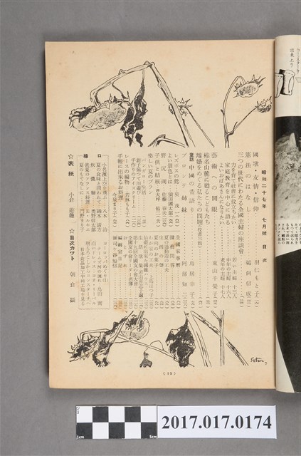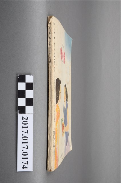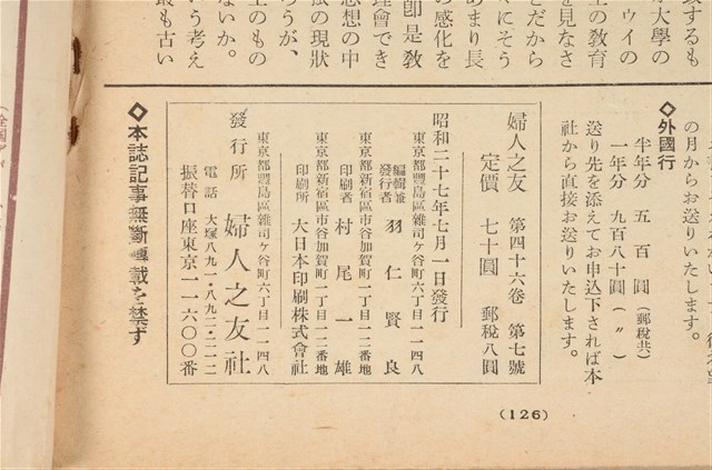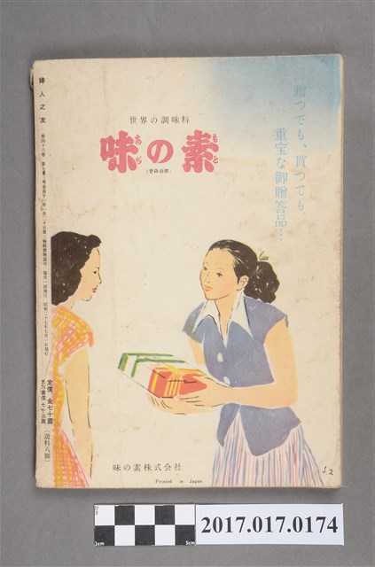 本物件為婦人之友社發行之《婦人之友》第46卷第7號,內容為:國歌友情信仰/羽仁とも子、憲法のはなし/?飼信成、三つの世代にわたる全國主婦の座談會、藝術への開眼/東山千榮子、榛名山麓に甦るこどのたち、離婚をめぐる私たちの問題(投書三篇)、童話 中國の昔語り/鳥居幸子、ブロンデ姉妹/阿部知二、レズボスの鶯/吳茂一、よい景色とは/須田國太郎、野尻湖/佐藤春夫、子供と結核/評 大坪佑二、楽しい夏のボラン バンカロー生活、親子揃って川並び 手作りのアイスクリーム、レース編み物/若林ももこ、手軽に出来る料理/今泉まり子、園藝問答、全國家事曆、夏の通勤着の工夫、生活の声、夏向のお菓子、わが家の工夫、仙臺に出来た国鉄ハウス、生活歌集/若山喜志子選、第十九回全國友の會大會、全國友の會リーダー名簿、おとずれ、編輯室日記、雜司ヶ谷短信、口繪。日本大正末期至昭和初期,由於關東大地震連帶使社會不景氣,出版社開始流行出版円本(類似專題書籍,常見命名為xx全集稱之)與文庫書(以A6為尺寸的書),除了一般書籍的編印外,為了及時反映社會訊息雜誌遂逐漸流行,譬如1932年日本圖謀建立滿州國時,日本國內就出現許多評論當時中國大陸的相關消息,1937年由於蘆溝橋事變,日本為了確保軍事物資,遂進行經濟統制,日本出版界便以情報宣傳機關管理國家力量開始介入,1938年甚至公告兒童雜誌字數限制、附錄廢止等政策,隨著戰事緊張,一些較無戰爭宣傳的雜誌被統合廢止,兒童或婦人雜誌也無法倖免,戰後,雜誌出版才得以逐一恢復。婦人之友社創立於1903年前身為『家庭の友』,創辦人為羽仁もと子與羽仁吉一,創刊目的基於基督教信仰如何向民眾傳達及經營理想家庭,而今(2015)仍持續發行。
