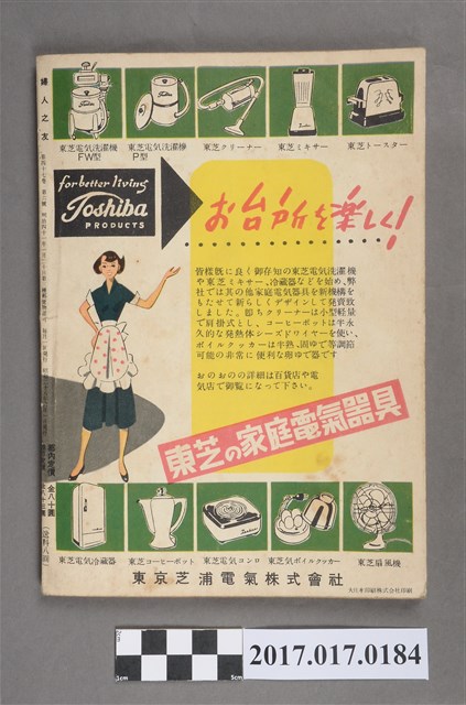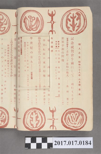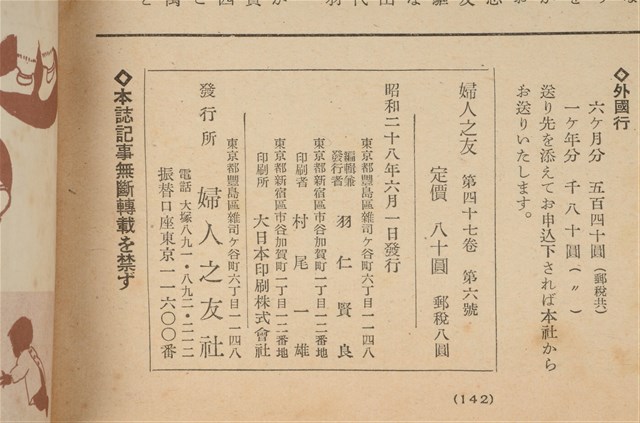 本物件為婦人之友社發行之《婦人之友》第47卷第6號,內容為:紀念祝賀會を前にして/羽仁とも子、北緯二十度の戰火/島田、世界平和の問題、初夏の高原/小山敬三、半世紀前の東京行樂/內田清之助、物を持たなかった生活/安倍こまを、半世紀の歩み、舞臺藝術放送藝術の話/內村直也、アイヌ村の十日間/杉浦須可子、健康通信簿/佐藤恒信、この子どもたちを誰がまもるか、ナイロンのブラウス/中島靜江、梅雨時のおべんとうの工夫、飛鳥/佐藤佐太郎、詩人の母マリーへッセの生涯/高橋健二、赤い小馬/西川正身、このごろ読んだもの/羽仁說子、クロレラの研究、乳房の檢查をしましょう/三浦貞子、山村の農家を開放して/松村定延、體操をしましょう/增田祥子、家計選手めぐり、夏の洗濯をさっばりと、六月の獻立/倉島日露子、家庭の花/淺山英一、果樹の實止り/高龜格三、新讀者紹介者氏名、おどずれ、生活歌集、編輯室日記、雜司ヶ谷短信、口繪。日本大正末期至昭和初期,由於關東大地震連帶使社會不景氣,出版社開始流行出版円本(類似專題書籍,常見命名為xx全集稱之)與文庫書(以A6為尺寸的書),除了一般書籍的編印外,為了及時反映社會訊息雜誌遂逐漸流行,譬如1932年日本圖謀建立滿州國時,日本國內就出現許多評論當時中國大陸的相關消息,1937年由於蘆溝橋事變,日本為了確保軍事物資,遂進行經濟統制,日本出版界便以情報宣傳機關管理國家力量開始介入,1938年甚至公告兒童雜誌字數限制、附錄廢止等政策,隨著戰事緊張,一些較無戰爭宣傳的雜誌被統合廢止,兒童或婦人雜誌也無法倖免,戰後,雜誌出版才得以逐一恢復。婦人之友社創立於1903年前身為『家庭の友』,創辦人為羽仁もと子與羽仁吉一,創刊目的基於基督教信仰如何向民眾傳達及經營理想家庭,而今(2015)仍持續發行。