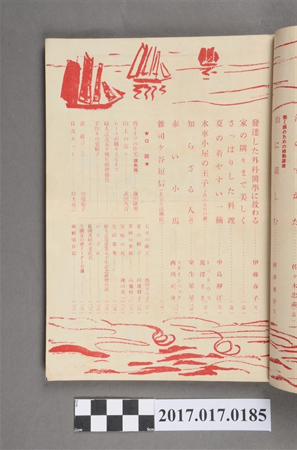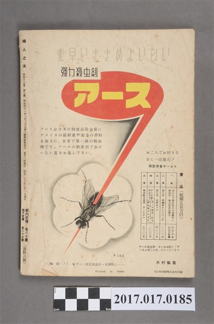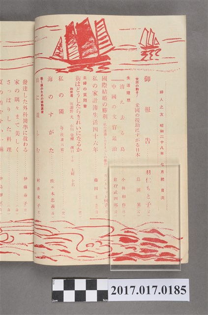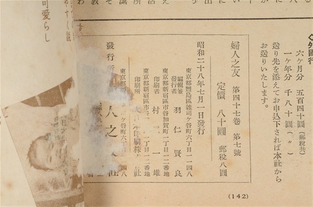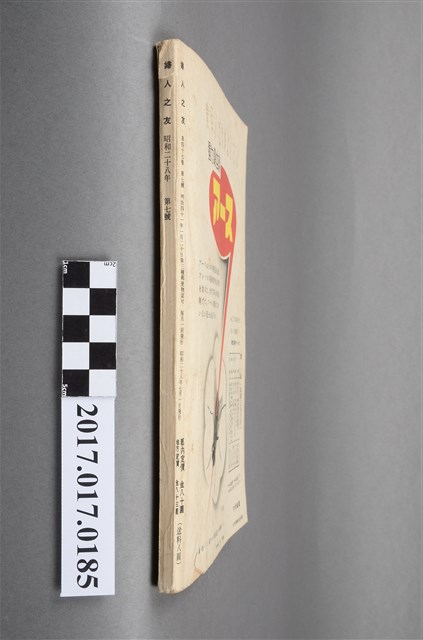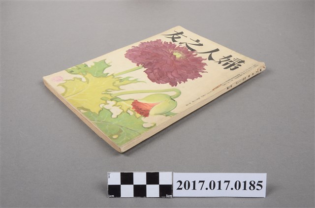 本物件為婦人之友社發行之《婦人之友》第47卷第7號,內容為:御報告/羽仁とも子、米國の援助にすがる日本/島田、消え来る島/小林和作、中國の文盲退治/倉石武四郎、國際結婚の勝利/ガントレット恒子、私の家計簿生活四十六年/藤田まさ、街はどうしたらきれいになるか、私の隣/佐々木忠義、山に親しむ/村井米子、發達した外科醫學に救わる/伊藤春子、家の隅まで美しく、さっばりした料理、夏の着やすい一揃/中島靜江、水車小屋の王子/萬澤まさ、知らざる人/室生犀星、赤い小馬/西川正身、七月の獻立/鶴田すみ子、全國友の会リーダー名簿、夏の帽子/田邊朋子、家庭の花/淺山英一、果樹の芽接/高龜格三、新讀者紹介者氏名、おどずれ、生活歌集、編輯室日記、雜司ヶ谷短信、口繪。日本大正末期至昭和初期,由於關東大地震連帶使社會不景氣,出版社開始流行出版円本(類似專題書籍,常見命名為xx全集稱之)與文庫書(以A6為尺寸的書),除了一般書籍的編印外,為了及時反映社會訊息雜誌遂逐漸流行,譬如1932年日本圖謀建立滿州國時,日本國內就出現許多評論當時中國大陸的相關消息,1937年由於蘆溝橋事變,日本為了確保軍事物資,遂進行經濟統制,日本出版界便以情報宣傳機關管理國家力量開始介入,1938年甚至公告兒童雜誌字數限制、附錄廢止等政策,隨著戰事緊張,一些較無戰爭宣傳的雜誌被統合廢止,兒童或婦人雜誌也無法倖免,戰後,雜誌出版才得以逐一恢復。婦人之友社創立於1903年前身為『家庭の友』,創辦人為羽仁もと子與羽仁吉一,創刊目的基於基督教信仰如何向民眾傳達及經營理想家庭,而今(2015)仍持續發行。