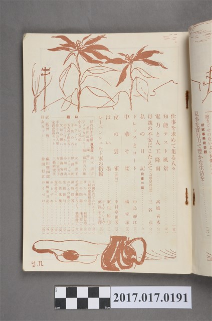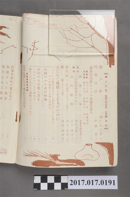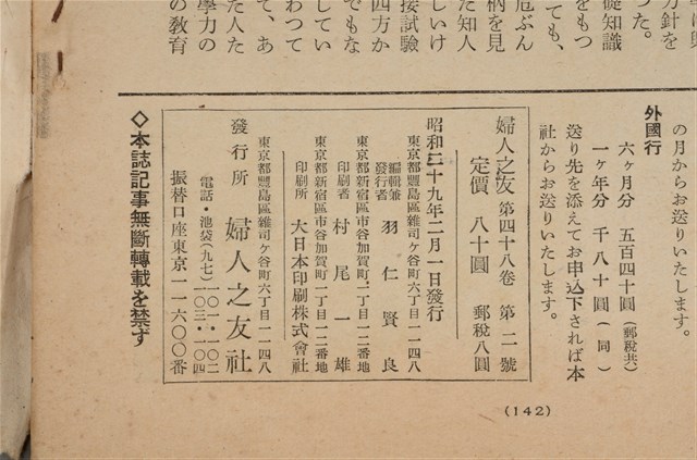 本文件為婦人之友社發行之《婦人之友》第48卷第2號,內容為:学ぶ心/羽仁とも子、世界の屋根ヒマラヤ登頂を語る、洒落た家/武者小路公共、一自然科學者のうれい/川村多實二、詩的隨思/江上波夫、時事日誌/伊藤昇、新生涯へ/川上末子、離婚/川島武宜、はじめて母親となる人のために、見事な実行力で豊かな生活を、仕事を求めて集る人々、知能テスト風景、電力と人工降雨/高橋喜彥、母親の不安にこたえて/三谷茂、私の日記、ドレッスとコート/中島靜江、中華そば/楊家達、夜の雲雀/中村草田男、はい墨/室生犀生、レーペンシエルド家の指輪/萬澤まさ、この国に育てたいこと、主婦の健康相談室、はちみつ/稻垣長典、土の問題/淺山英一、毛系の手藝いろいろ/?岡澄子、鍋物問答、おひるの獻立、おどずれ、生活歌集、生活非句、友の會のページ、おとずれ、編輯室日記、雜司ヶ谷短信、口繪。日本大正末期至昭和初期,由於關東大地震連帶使社會不景氣,出版社開始流行出版円本(類似專題書籍,常見命名為xx全集稱之)與文庫書(以A6為尺寸的書),除了一般書籍的編印外,為了及時反映社會訊息雜誌遂逐漸流行,譬如1932年日本圖謀建立滿州國時,日本國內就出現許多評論當時中國大陸的相關消息,1937年由於蘆溝橋事變,日本為了確保軍事物資,遂進行經濟統制,日本出版界便以情報宣傳機關管理國家力量開始介入,1938年甚至公告兒童雜誌字數限制、附錄廢止等政策,隨著戰事緊張,一些較無戰爭宣傳的雜誌被統合廢止,兒童或婦人雜誌也無法倖免,戰後,雜誌出版才得以逐一恢復。婦人之友社創立於1903年前身為『家庭の友』,創辦人為羽仁もと子與羽仁吉一,創刊目的基於基督教信仰如何向民眾傳達及經營理想家庭,而今(2015)仍持續發行。