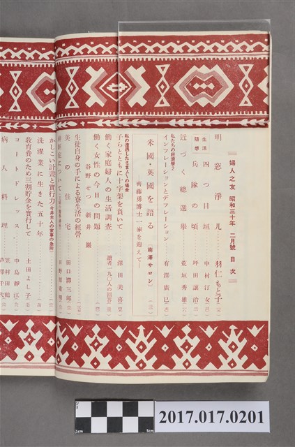 本文件為婦人之友社發行之《婦人之友》第49卷第2號,內容為:明窗几淨/羽仁とも子、四つ目垣/中村汀女、兵隊の頃/坪田讓治、近つく總選舉/荒垣秀雄、インフレーションとデフレーション/有澤廣巳、米國英國を語る、子ら供とともに十字架を負いて片岡美智、働く家庭婦人の生活調査、働く女性の今日の問題、生徒自身のてによる寮生活の経営、美の住宅/田口柳三郎、神經症について/日野原重明、???、かしこい計画と實行力、洗濯業に生きた五十年、教育費のため三割貯金を實行して/土田よし子、コートドレッス/中島静江、病人料理/笠村田鶴蘆澤千代 、ぎりしあ人の女性觀/吳茂一、一つの今日/長語善郎、コンスタンタン司祭/山內義雄、カロチン、子供の劇場/稻垣長典、中華そば/馬遲昌伯、果物クッション/陳不二子、生活歌集/若山喜志子選、生活非句/星野立子選、友の會のページ、おとずれ、編輯室日記、雜司ヶ谷短信、口繪。日本大正末期至昭和初期,由於關東大地震連帶使社會不景氣,出版社開始流行出版円本(類似專題書籍,常見命名為xx全集稱之)與文庫書(以A6為尺寸的書),除了一般書籍的編印外,為了及時反映社會訊息雜誌遂逐漸流行,譬如1932年日本圖謀建立滿州國時,日本國內就出現許多評論當時中國大陸的相關消息,1937年由於蘆溝橋事變,日本為了確保軍事物資,遂進行經濟統制,日本出版界便以情報宣傳機關管理國家力量開始介入,1938年甚至公告兒童雜誌字數限制、附錄廢止等政策,隨著戰事緊張,一些較無戰爭宣傳的雜誌被統合廢止,兒童或婦人雜誌也無法倖免,戰後,雜誌出版才得以逐一恢復。婦人之友社創立於1903年前身為『家庭の友』,創辦人為羽仁もと子與羽仁吉一,創刊目的基於基督教信仰如何向民眾傳達及經營理想家庭,而今(2015)仍持續發行。