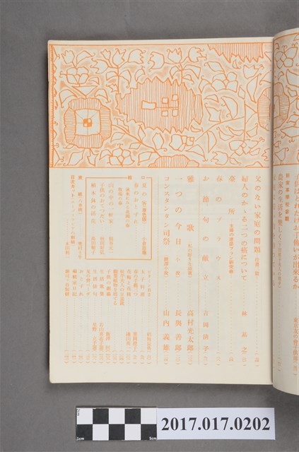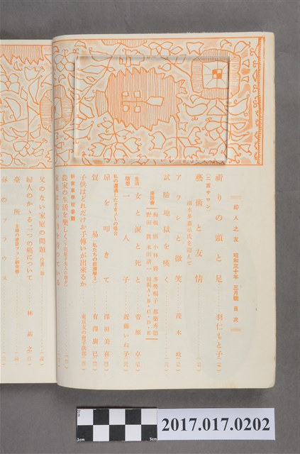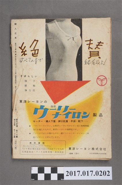 本物件為婦人之友社發行之《婦人之友》第49卷第3號,內容為:祈りの頭と足/羽仁とも子、藝術と友情、ラシと微笑/茂木政、驗地獄を嘆く、女と涙と死と/菅原卓、一人子/近藤いね子、扉を叩きて/澤田美喜、貿易/有澤廣巳、子供はどれだけお手伝いが出来るか/東京友の会子供部、農家の生活を楽しく、家庭は若い力を持っている、父のない家庭の問題、婦人のかいる二つの癌について/林基之、臺所、春のブラウス、お節句の獻立/吉岡清子、雅歌/高村光太郎、一つの今日/長與善郎 、コンスタンタン司祭/山内義雄、一つの今日/長語善郎、コンスタンタン司祭/山內義雄、ビタミンB2/道垣長典、玉子料理、春の手藝三つ/?岡澄子、花梅と花桃/淺山英一、松平夫人の豆盆栽、觀葉植物を育てる、子供の劇場、生活歌集/若山喜志子選、生活非句/星野立子選、友の會のページ、おとずれ、編輯室日記、雜司ヶ谷短信、口繪。日本大正末期至昭和初期,由於關東大地震連帶使社會不景氣,出版社開始流行出版円本(類似專題書籍,常見命名為xx全集稱之)與文庫書(以A6為尺寸的書),除了一般書籍的編印外,為了及時反映社會訊息雜誌遂逐漸流行,譬如1932年日本圖謀建立滿州國時,日本國內就出現許多評論當時中國大陸的相關消息,1937年由於蘆溝橋事變,日本為了確保軍事物資,遂進行經濟統制,日本出版界便以情報宣傳機關管理國家力量開始介入,1938年甚至公告兒童雜誌字數限制、附錄廢止等政策,隨著戰事緊張,一些較無戰爭宣傳的雜誌被統合廢止,兒童或婦人雜誌也無法倖免,戰後,雜誌出版才得以逐一恢復。婦人之友社創立於1903年前身為『家庭の友』,創辦人為羽仁もと子與羽仁吉一,創刊目的基於基督教信仰如何向民眾傳達及經營理想家庭,而今(2015)仍持續發行。