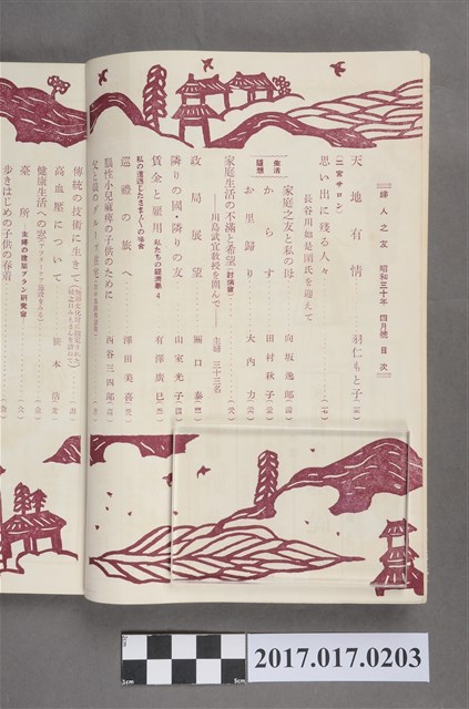 本文件為婦人之友社發行之《婦人之友》第49卷第4號,內容為:天地有情/羽仁とも子、思い出に残る人々、家庭の友/向坂逸郎、からす/田村秋子、お里帰り/大内力、家庭生活の不滿と希望、政局展望/關口泰、隣りの国隣りの友/山室光子、賃金と雇用/有澤廣巳、巡禮の旅へ/澤田美喜、腦性小兒麻痺の子供ために/西谷三四郎、父と娘のグループ住宅、傳統の技術に生きて、健康生活への窓、臺所、歩きはじめの子供の春着、豚料理五種/小澤きん、奈良春唱/吉野秀雄、一つの今日/長與善郎 、コンスタンタン司祭/山内義雄、アリサイアシン/道垣長典、主婦の健康相談室/日野原重明、金網のボディー/古澤貞子、日本花卉/淺山英一、ロシア菓子/石黑茂、洋野菜/高龜格三、子供の劇場/飯澤匡、生活歌集/若山喜志子選、生活非句/星野立子選、友の會のページ、おとずれ、編輯室日記、雜司ヶ谷短信、口繪。日本大正末期至昭和初期,由於關東大地震連帶使社會不景氣,出版社開始流行出版円本(類似專題書籍,常見命名為xx全集稱之)與文庫書(以A6為尺寸的書),除了一般書籍的編印外,為了及時反映社會訊息雜誌遂逐漸流行,譬如1932年日本圖謀建立滿州國時,日本國內就出現許多評論當時中國大陸的相關消息,1937年由於蘆溝橋事變,日本為了確保軍事物資,遂進行經濟統制,日本出版界便以情報宣傳機關管理國家力量開始介入,1938年甚至公告兒童雜誌字數限制、附錄廢止等政策,隨著戰事緊張,一些較無戰爭宣傳的雜誌被統合廢止,兒童或婦人雜誌也無法倖免,戰後,雜誌出版才得以逐一恢復。婦人之友社創立於1903年前身為『家庭の友』,創辦人為羽仁もと子與羽仁吉一,創刊目的基於基督教信仰如何向民眾傳達及經營理想家庭,而今(2015)仍持續發行。