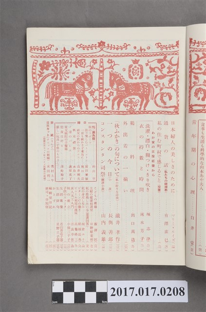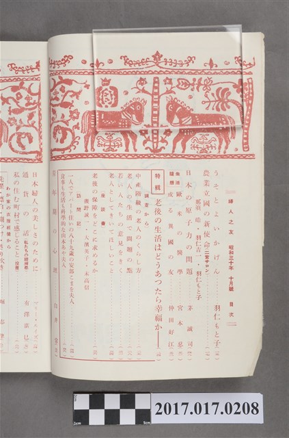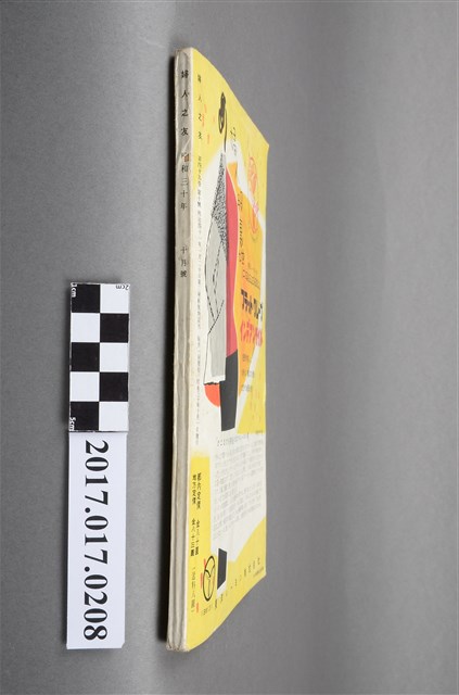 本物件為婦人之友社發行之《婦人之友》第49卷第10號,內容為:うそとよいかげん/羽仁とも子、農業立國の新使命、日本の原子力の問題/茅誠司、歐米の醫學/宮本忍、或る異國の友/仲田好江、老後の生活はどうあったら幸福か、青春期の心理/臼井常、日本婦人の美しさのために/マリー・ルイズ、通貨の話/有澤廣巳、私の住む町村で感じること、わが家の衣服経営から、鶏料理、外出着の一揃い、秋ふかきの句について/瀧井孝作、一つの今日/長與善郎 、コンスタンタン司祭/山内義雄、子ども劇場/飯澤匡、主婦の健康相談室/日野原重明、私の推薦したい本、私の身だしなみ/板倉ユリ、素人大工入門/吉良幸世、ビタミンCの働き/道垣長典、ビニール利用の溫床/高歸格三、秋の獻立/小熊三千子、子供のスェーター、生活歌集/若山喜志子選、生活非句/星野立子選、友の會のページ、おとずれ、編輯室日記、雜司ヶ谷短信、口繪。日本大正末期至昭和初期,由於關東大地震連帶使社會不景氣,出版社開始流行出版円本(類似專題書籍,常見命名為xx全集稱之)與文庫書(以A6為尺寸的書),除了一般書籍的編印外,為了及時反映社會訊息雜誌遂逐漸流行,譬如1932年日本圖謀建立滿州國時,日本國內就出現許多評論當時中國大陸的相關消息,1937年由於蘆溝橋事變,日本為了確保軍事物資,遂進行經濟統制,日本出版界便以情報宣傳機關管理國家力量開始介入,1938年甚至公告兒童雜誌字數限制、附錄廢止等政策,隨著戰事緊張,一些較無戰爭宣傳的雜誌被統合廢止,兒童或婦人雜誌也無法倖免,戰後,雜誌出版才得以逐一恢復。婦人之友社創立於1903年前身為『家庭の友』,創辦人為羽仁もと子與羽仁吉一,創刊目的基於基督教信仰如何向民眾傳達及經營理想家庭,而今(2015)仍持續發行。