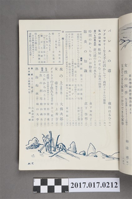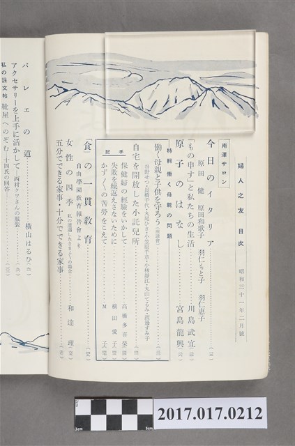 本文件為婦人之友社發行之《婦人之友》第50卷第2號,內容為:今日のイタリア、もの申す/川島武宜、原子の話/宮島龍興、特輯、食の一貫教育、女性の四季/和達瑾、五分でできる家事十分でできる家事、バレエの道/横山はるひ、アクセサリーを上手に活かして、靴屋へのぞむ、時間のかいらないお?菜/森下加代子、肺炎の知識/真下啟明、水の上/大佛次郎、女帝/三上秀吉、グリトリの子どもたち/野上三枝子、追憶/安倍能成、これからのこと/中野恒子、魚の利用/檜山義夫、熱海梅林/堀口大學、育兒のパージ/廣瀨興、母親のス-ッからツクッタ子供フク/楠井美子、春のセーター/自由學園工藝研究所、やさしいお菓子/福島登美子、大豆の用途はこんなに広い、生活歌集/若山喜志子選、生活非句/星野立子選友の會のページ、おとずれ、編輯室日記、雜司ヶ谷短信、口繪。日本大正末期至昭和初期,由於關東大地震連帶使社會不景氣,出版社開始流行出版円本(類似專題書籍,常見命名為xx全集稱之)與文庫書(以A6為尺寸的書),除了一般書籍的編印外,為了及時反映社會訊息雜誌遂逐漸流行,譬如1932年日本圖謀建立滿州國時,日本國內就出現許多評論當時中國大陸的相關消息,1937年由於蘆溝橋事變,日本為了確保軍事物資,遂進行經濟統制,日本出版界便以情報宣傳機關管理國家力量開始介入,1938年甚至公告兒童雜誌字數限制、附錄廢止等政策,隨著戰事緊張,一些較無戰爭宣傳的雜誌被統合廢止,兒童或婦人雜誌也無法倖免,戰後,雜誌出版才得以逐一恢復。婦人之友社創立於1903年前身為『家庭の友』,創辦人為羽仁もと子與羽仁吉一,創刊目的基於基督教信仰如何向民眾傳達及經營理想家庭,而今(2015)仍持續發行。