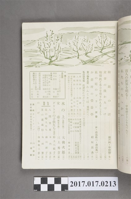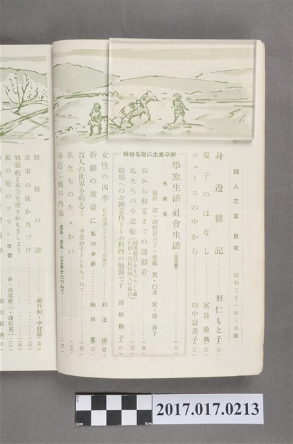 本文件為婦人之友社發行之《婦人之友》第50卷第3號,內容為:身邊雜記/羽仁とも子、原子のはなし/宮島龍興、ニュースの中から/田中壽美子、學窓生活 社会生活、女性の四季/和達瑾、新劇の舞臺に/楠田薫、盲人の世界を明るく、私たちのたいかい、春近し瀬戸内海、眼鏡の話/瀨戶糾中村陽、食事の後かたつけ、勉強机と本立を塗りかえましょう、私の庭のプラン投?/高龜格三淺山英一、お臺所の營養學/道垣長典、わんこそばー盛岡にて、水の上/大佛次郎、女帝/三上秀吉、グリトリの子どもたち/野上三枝子、人間尊重/木內克、北の婦人たち/瀬川清子、?の?通信/外村繁、のばし(詩)/西?順三郎、育兒相談/廣瀨興、人形作り/內田さつき、動物作り/森川和子、手軽にできる食後のお菓子/鈴木敏雄、友の會のページ、愛讀者歌の会、生活歌集/若山喜志子選、生活非句/星野立子選、おとずれ、編輯室日記、雜司ヶ谷短信、口繪。日本大正末期至昭和初期,由於關東大地震連帶使社會不景氣,出版社開始流行出版円本(類似專題書籍,常見命名為xx全集稱之)與文庫書(以A6為尺寸的書),除了一般書籍的編印外,為了及時反映社會訊息雜誌遂逐漸流行,譬如1932年日本圖謀建立滿州國時,日本國內就出現許多評論當時中國大陸的相關消息,1937年由於蘆溝橋事變,日本為了確保軍事物資,遂進行經濟統制,日本出版界便以情報宣傳機關管理國家力量開始介入,1938年甚至公告兒童雜誌字數限制、附錄廢止等政策,隨著戰事緊張,一些較無戰爭宣傳的雜誌被統合廢止,兒童或婦人雜誌也無法倖免,戰後,雜誌出版才得以逐一恢復。婦人之友社創立於1903年前身為『家庭の友』,創辦人為羽仁もと子與羽仁吉一,創刊目的基於基督教信仰如何向民眾傳達及經營理想家庭,而今(2015)仍持續發行。