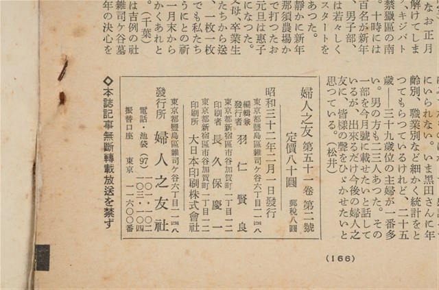 本文件為婦人之友社發行之《婦人之友》第51卷第2號,內容為:自然の風土と習慣/つださうきち、日本の國連加盟と國際政局、嫁と姑の懇談會、あなたの日曜日は/十一氏の回答、淚とともに播くもの/三田庸子、雪山に生きる女性/近藤等、私の最愛のロッテーレーマン先生/矢野滋、雪ふかし凶作地/渡辺ハツエ、知能の意味/白井常、小學生の國語、わかい母親の創意にみちた、調理室の一隅で/木內ひさ子、農村の子供よふとれ、痔はなぜ起るか/前田友助、多すぎず少なすぎない食器の数は、母の入院主婦の出產とつ?いた家計、あたたいかい中國風鍋物/馬遲伯昌、獻立の手引/澤崎梅子、ツイードのワンピース/小林英子 中島靜江、寫真、尾根・最後の橋/朝倉攝、生活隨想、ヘッセの青いチョウ/高橋健二、ロシキー爺さん/西川正身、女にうまれて/芹澤光治良、日用品のふるさとものさし、二月の花曆/淺山英一、室內フレーム、電器掃除機、二月の編物、生活歌集/若山喜志子選、生活非句/星野立子選、ブラジルだより、おどずれ、編輯室日記、雜司ヶ谷短信、口繪。日本大正末期至昭和初期,由於關東大地震連帶使社會不景氣,出版社開始流行出版円本(類似專題書籍,常見命名為xx全集稱之)與文庫書(以A6為尺寸的書),除了一般書籍的編印外,為了及時反映社會訊息雜誌遂逐漸流行,譬如1932年日本圖謀建立滿州國時,日本國內就出現許多評論當時中國大陸的相關消息,1937年由於蘆溝橋事變,日本為了確保軍事物資,遂進行經濟統制,日本出版界便以情報宣傳機關管理國家力量開始介入,1938年甚至公告兒童雜誌字數限制、附錄廢止等政策,隨著戰事緊張,一些較無戰爭宣傳的雜誌被統合廢止,兒童或婦人雜誌也無法倖免,戰後,雜誌出版才得以逐一恢復。婦人之友社創立於1903年前身為『家庭の友』,創辦人為羽仁もと子與羽仁吉一,創刊目的基於基督教信仰如何向民眾傳達及經營理想家庭,而今(2015)仍持續發行。