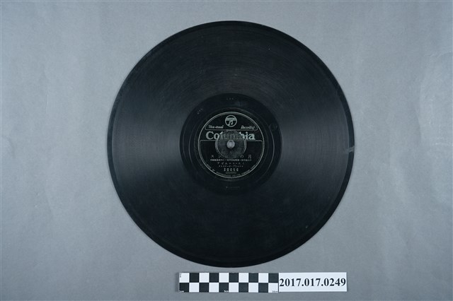 本文件為蟲膠唱片《鄉土部隊の勇士から》,由古倫美亞唱片公司發行之雙面蟲膠,雙面各收錄曲目時局歌謠鄉土部隊の勇士から、月のコロンス,由松平晃演唱。上頭印有古倫美亞唱片公司音符商標圖樣。1907年日美兩方合資成立「日本蓄音器製造株式會社」為日本第一家自製留聲機和唱片的公司。1910年改名為「日本蓄音器商會」,並在同年11月派駐臺機關「日蓄臺北出張所」,開始拓展其在臺業務。然而臺灣黑膠唱片的普及則要到1925年以後,當時為了降低唱片的售價,而採用成本較低的上漆紙板,也一般民眾也負擔得起,此後唱片就逐漸流行起來。隨日蓄在臺灣的「出張所」成立後,日本國內各家唱片公司也紛紛前來臺灣成立「分店」,如鶴標、新高、文聲、羊標、金鳥、東洋、駱駝、飛鷹…等,所發行的唱片以歌仔戲、歌仔曲、山歌、採茶歌為主,展開了臺灣音樂唱片錄製的工作。
