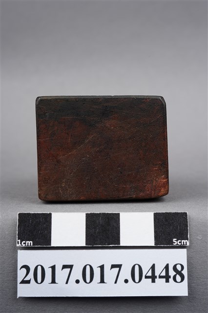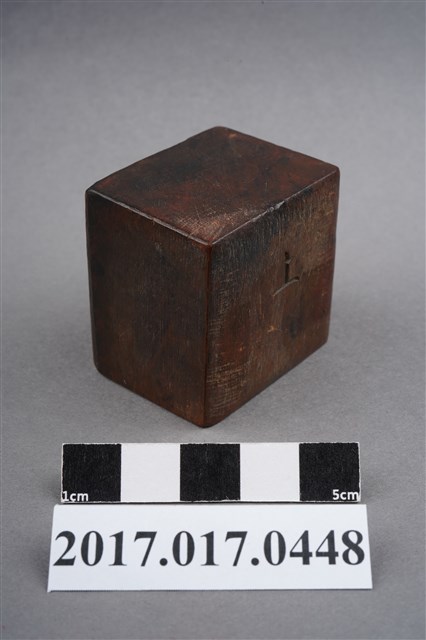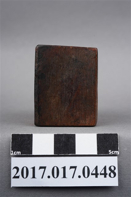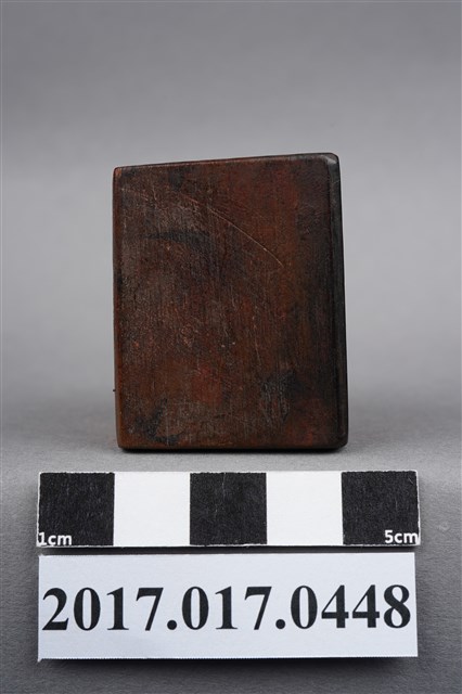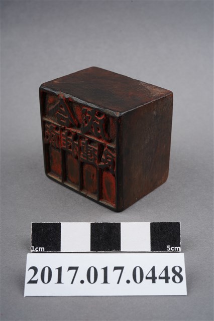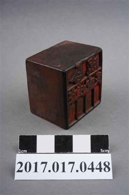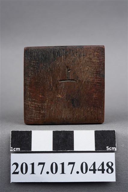 本文物為合成印鑑,上面刻有底、挂、連、艮的字樣,字體以正方形方框框起來。印鑑年代應為無法判斷,材質為木製,保存狀況完整。