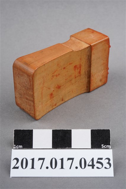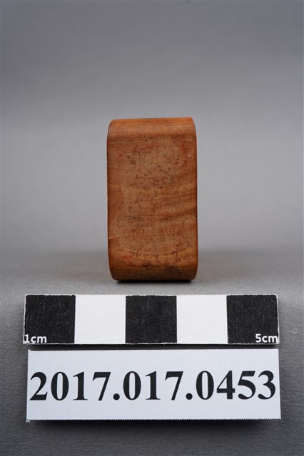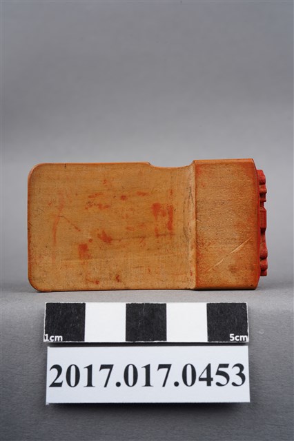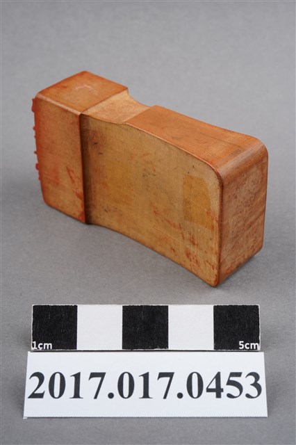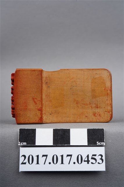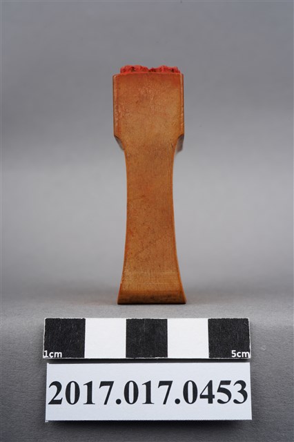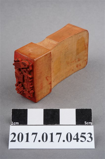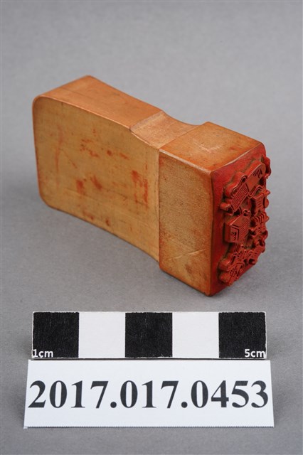 本文物為頂發印鑑,印鑑上刻有許多花樣並圍繞在頂發周圍,年代無法判斷,材質為木製長方體,保存狀況完整。