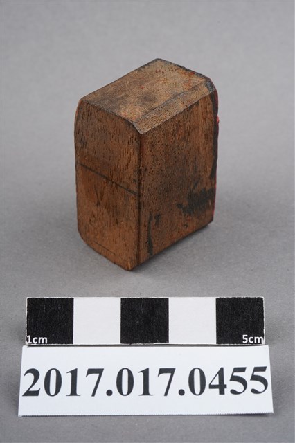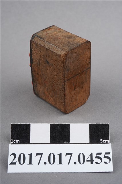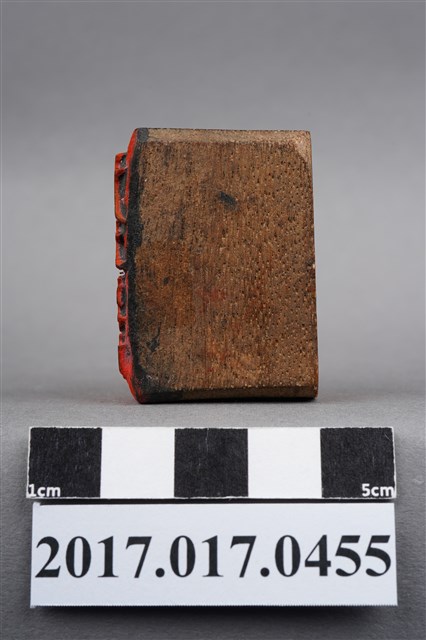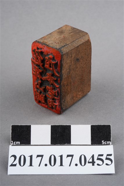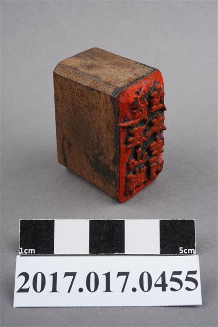 本文物為筵在山腳庄本宅內印鑑,印鑑年代無法判斷,材質為木製長方體,陽刻,保存狀況完整。