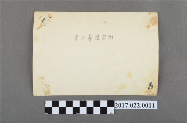 謝招治(第1排左4)參加手工藝講習班,學習編籃上課的情景。照片背面寫有「手工藝講習班」等字。 本張黑白照片原黏貼於某一相簿中,後被單張取出。