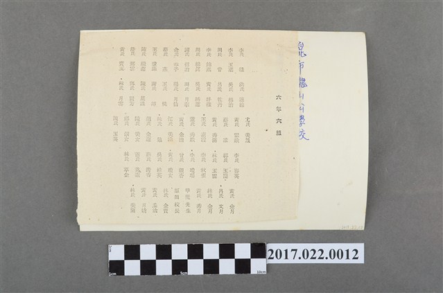 臺北市龍山公學校第23屆六年六組(班)同學畢業合照,照片中人物有原田校長(第1排左5)、班導師甲斐美智子先生(第1排左6)、謝招治(最後排右6)。照片背面寫有「台北市龍山公學校第廿三屆六組同學畢業紀念」等字,及張貼六年六組(班)畢業照上對應的人名表。本件可能為戰後重新沖印的照片。