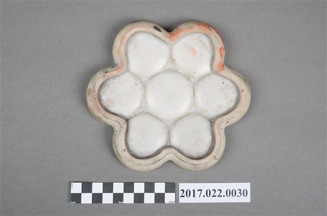 謝招治使用的水墨畫用具。 塑膠製調色盤,白色,作梅花造型,分成7格可供調色。其中2格殘留有紅色、綠色乾掉的顏料色塊,其餘可見調色過朱紅、土黃、鮮橙等色的使用痕跡。