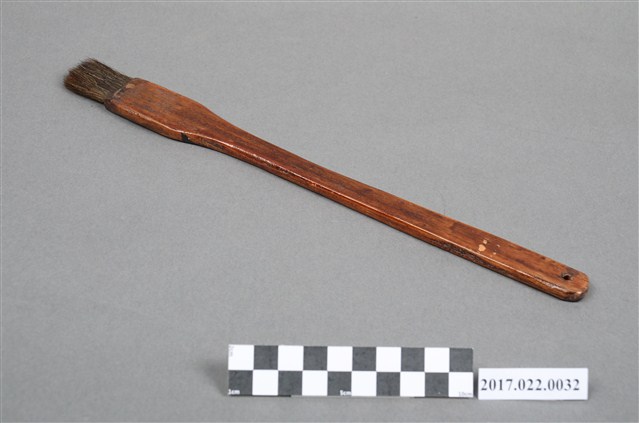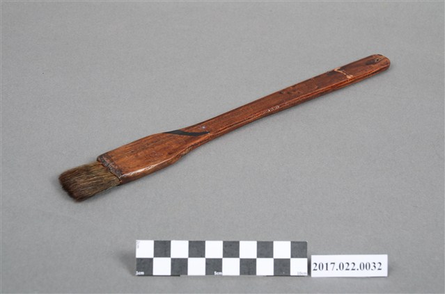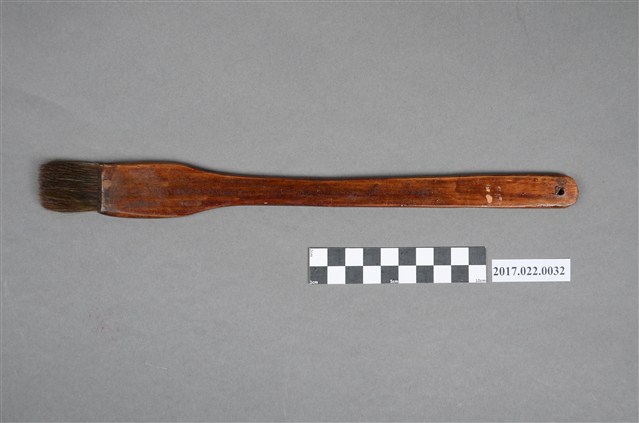 謝招治使用的水墨畫畫具。 排刷,平頭,筆桿為棕色,作為打底色等大面積表現使用。本件筆寬大於編號105059-0028,可作更大面積的表現。