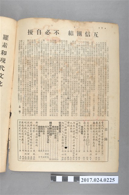本文物為民國47年(1958年)2月5日出版的文星雜誌第一卷第四期,為總發行的第4期,其封面人物為哲學家羅素(Bertrand Russell),其內容除封面人物介紹外,也有國外的藝文欣賞、科學新知、思想、小篇詩集等內容。 文星雜誌為民國46年(1957年)11月5日,由文星書店所發行,發行人為葉明勳,社長則為文星書店創辦人蕭孟能,其發刊詞〈不按牌理出牌〉也展現其理念為「不按常規辦這份雜誌」,其內容以西洋文學翻譯、科普知識、國外思想、學校的介紹,也刊登臺灣所創作的詩、小說