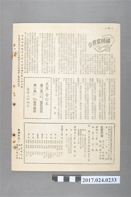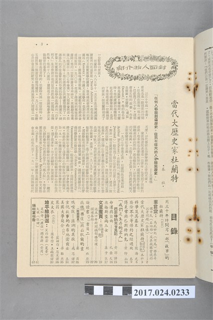 本文物為民國48年(1959年)2月1日出版的文星雜誌第三卷第四期,為總發行的第16期,其封面人物為歷史學家杜蘭特(Will Durant),其內容除封面人物介紹外,也有國外的藝文欣賞、科學新知、思想、小篇詩集等內容。