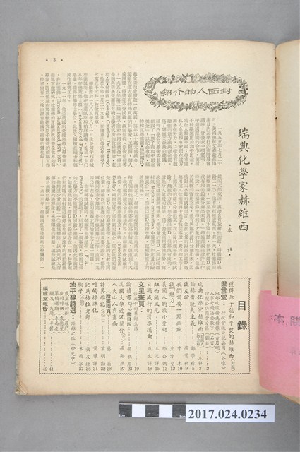 本文物為民國48年(1959年)4月1日出版的文星雜誌第三卷第六期,為總發行的第18期,其封面人物為瑞典化學家赫維西(George Charles De Hevesy),其內容除封面人物介紹外,也有國外的藝文欣賞、科學新知、思想、小篇詩集等內容。 文星雜誌為民國46年(1957年)11月5日,由文星書店所發行,發行人為葉明勳,社長則為文星書店創辦人蕭孟能,其發刊詞〈不按牌理出牌〉也展現其理念為「不按常規辦這份雜誌」,其內容以西洋文學翻譯、科普知識、國外思想、學校的介紹,也刊