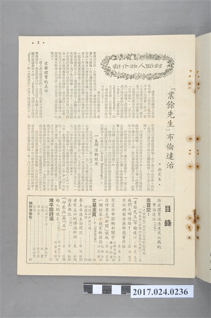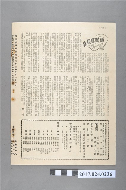 本文物為民國48年(1959年)6月1日出版的文星雜誌第四卷第二期,為總發行的第20期,其封面人物為主張運動道德的布倫達治(Avery Brundage),其內容除封面人物介紹外,也有國外的藝文欣賞、科學新知、思想、小篇詩集等內容。 文星雜誌為民國46年(1957年)11月5日,由文星書店所發行,發行人為葉明勳,社長則為文星書店創辦人蕭孟能,其發刊詞〈不按牌理出牌〉也展現其理念為「不按常規辦這份雜誌」,其內容以西洋文學翻譯、科普知識、國外思想、學校的介紹,也刊登臺灣所創作