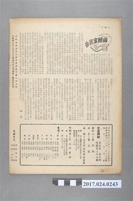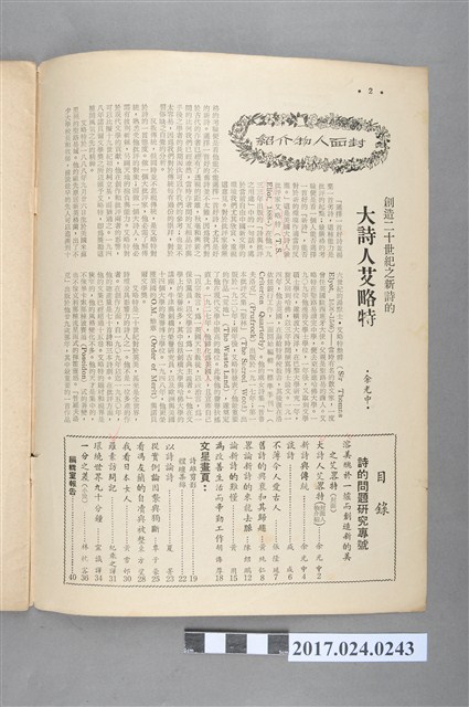 本文物為民國49年(1960年)1月1日出版的文星雜誌第五卷第三期,為總發行的27期,其封面人物為美國詩人艾略特(T.S.Eliot),其內容除封面人物介紹外,也有國外的藝文欣賞、科學新知、思想、小篇詩集等內容。 文星雜誌為民國46年(1957年)11月5日,由文星書店所發行,發行人為葉明勳,社長則為文星書店創辦人蕭孟能,其發刊詞〈不按牌理出牌〉也展現其理念為「不按常規辦這份雜誌」,其內容以西洋文學翻譯、科普知識、國外思想、學校的介紹,也刊登臺灣所創作的詩、小說等等,在民國52年(19