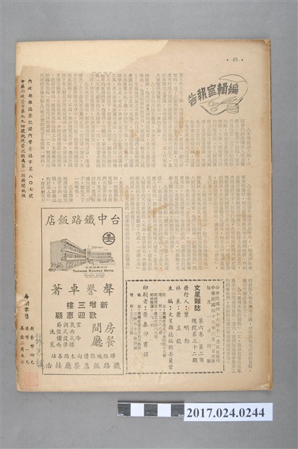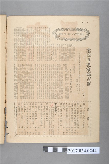 本文物為民國49年(1960年)6月1日出版的文星雜誌第六卷第二期,為總發行的32期,其封面人物為英國宰相邱吉爾(Sir Winston Leonard Spencer Churchill),其內容除封面人物介紹外,也有國外的藝文欣賞、科學新知、思想、小篇詩集等內容。 文星雜誌為民國46年(1957年)11月5日,由文星書店所發行,發行人為葉明勳,社長則為文星書店創辦人蕭孟能,其發刊詞〈不按牌理出牌〉也展現其理念為「不按常規辦這份雜誌」,其內容以西洋文學翻譯、科普知識、國外思想、學校的