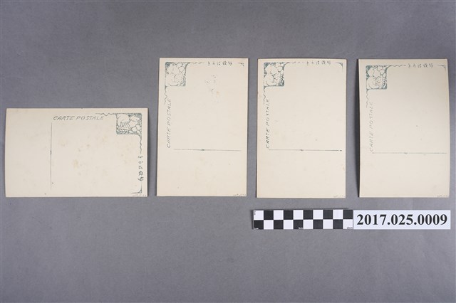 1.此文物為台灣木板印刷明信片,共計4張,內容分別為急公好義坊、艋舺龍山寺惜字亭、台北總督府官邸、台北公園長官官邸,上面都蓋有大正博覽會台灣館紀念戳章,其中急公好義坊、艋舺龍山寺惜字亭、台北總督府官邸皆採直式繪圖,只有台北公園長官官邸採橫式繪圖。