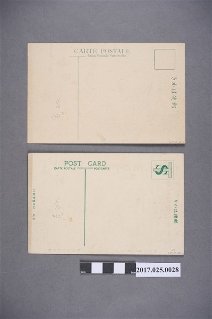 此文物為一組兩張,為黑白印刷明信片,圖案皆為臺灣總督官邸外觀,但一為近照,一為遠觀。其右上角皆有壹錢五厘的郵票,並蓋上「臺灣總督府始政第十五回紀念.43.6.17」的郵戳。