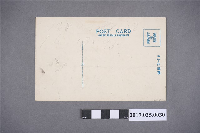 本文物為印有臺灣總督府土木部辦公大樓之黑白明信片,其底下印有Goverment office of Formosa及(臺灣)總督府土木部字樣。土木部位於總督府左方,由森山松之助在明治40年(1907)設計,於大正八年(1919)改為臺灣電力株式會社。明信片背面郵戳處的「MADE IN JAPAN」字樣可知此套明信片是在日本所製。