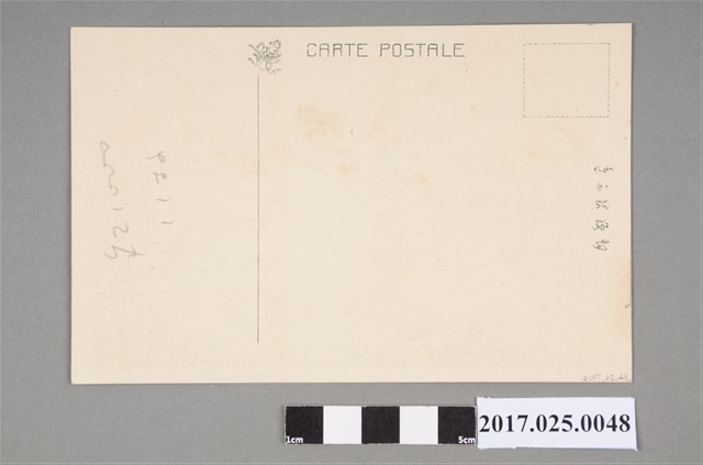 本文物為大正時期印刷出品之澎湖島日軍千人塚黑白明信片,影像中可見以石造圍牆圍出千人塚之範圍。明信片外圍留白框,底下寫有「澎湖島中關於二十八年領臺之際將榮譽戰死者合葬的千人塚」,後附註「澎湖島坂井商店發行」,明信片右上亦有坂井商店所刻的「迴航紀念澎湖島坂井繪葉書店」章,圖案為桂冠葉與船錨。明信片背面以一直線分隔書寫內容與地址之處,線的上方印有長翅膀的馬,並印有「CARTE POSTALE」、「郵便はがき」等字樣。而在內容欄位處有以鉛筆書寫、不明用意的兩行數字。