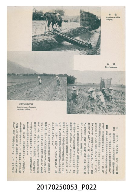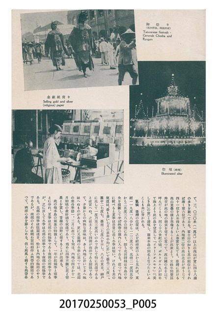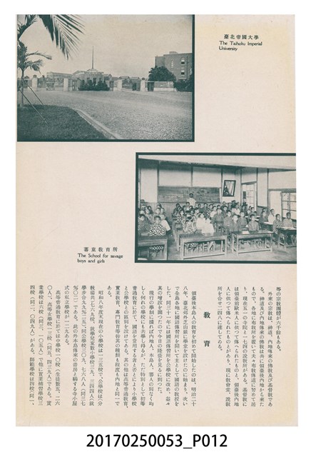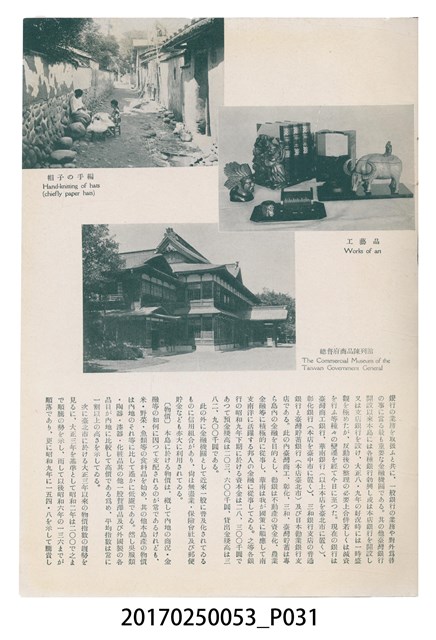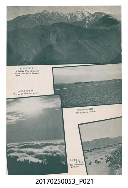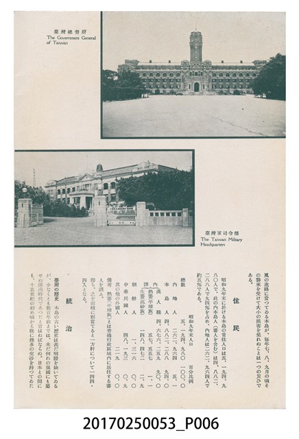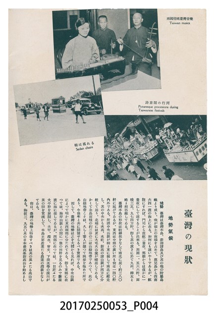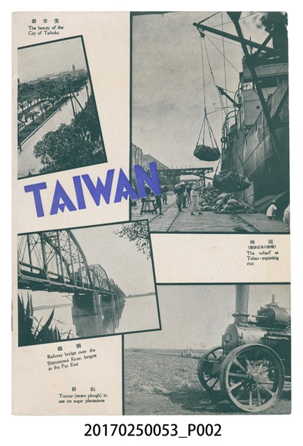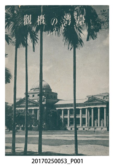 本物件為日治時期出版之書,封面為一棟建物及椰子樹,上面印有「臺湾の概觀」;封底為身著旗袍的女子站於岸邊,並印有「TAIWAN」及「40 SEN」的字樣。本書為山源製版印刷,臺北勝山寫真館合資發行。