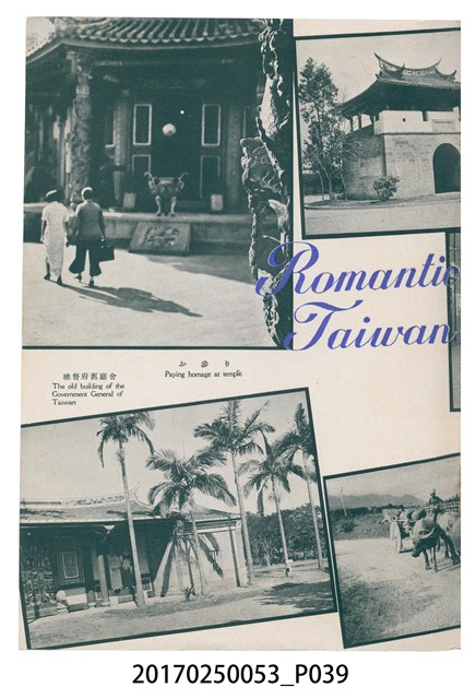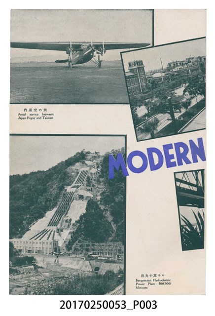 書籍文字介紹分為地勢氣候、住民、宗教等16項標題。圖片包含專賣局、民間習俗、人民生活狀況及當時重要地標,如日月潭大觀發電廠、臺灣神社、總督府等。書中兩頁印有「MORDEN TAIWAN」及「Romantic Taiwan」的藍色字樣。