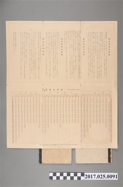 文物共3件,年代為昭和時期。文物由左至右依序為「明治生命の保險案內」、「株式會社日本勸業銀行臺北之店保護預通帳」、「有限責任新竹信用組合小口貯金通帳」。其中明治生命該冊子背面印有各營業所地址及電話。