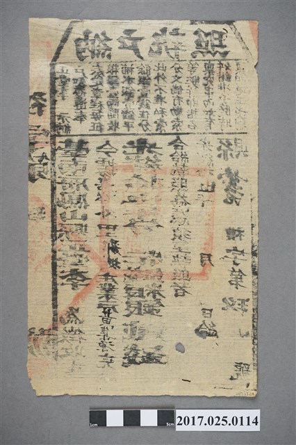 本文物為光緒15年納戶執照,張數一張,以中文書寫,並有4個戳印,但都已辨識不清。此納戶執照為光緒15年(1889),臺南府鳳山縣正堂李徵收嘉祥外里,郡城庄業戶黃集源錢糧銀二錢,所給的證明文件。為縣禮字第9號。