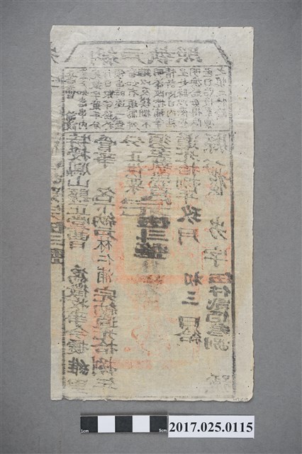 1.本文物為道光18年納戶執照,張數一張,以中文書寫,並有3個戳印,但都已辨識不清。此納戶執照為道光18年(1838)9月3日,鳳山縣正堂曹為證明納戶林仁浦已繳納維里,伍斗整的正供粟,所給的證明文件。