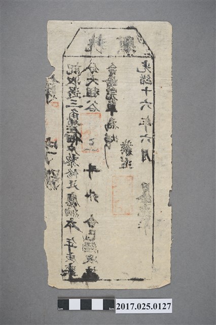 本文物為光緒16年(1890年)6月振發記執照,內容記錄計收過三角埔庄佃戶黎修廷,應納本年庚寅分大租谷3斗,外合已經狀○合給完單為據。業主為振發記。另外,執照上面有多處振發記之刻印。