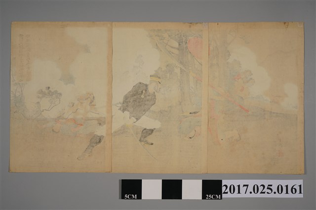 本文物為粟田大衛澎湖島馬公城攻擊圖,描繪粟田大衛帶兵攻擊澎湖島馬公城,並與清朝官兵奮戰的英勇模樣,全部共有三幅。為明治28年(1895年)松野米次郎畫作印刷兼發行。