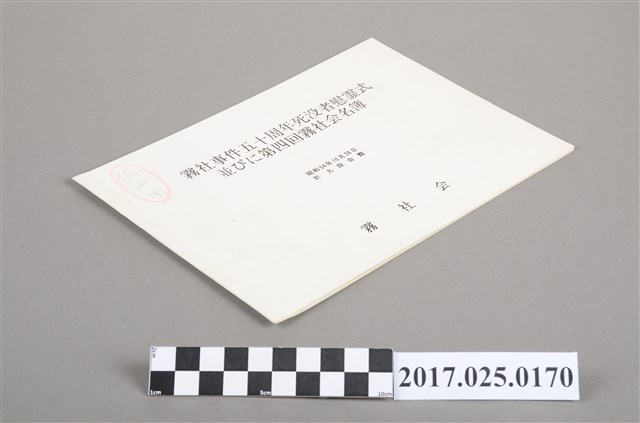 本文物為霧社會於霧社事件五十周年死沒者慰靈式、第四回霧社會名簿,封面上並寫有「昭和54年10月28日於九段会館」的字樣,在其左上角並有寫著「佐山用」並用紅圈框起的字樣。而其內容由左至右書寫,欄位分別為「県名」、「出席」、「氏名」、「郵便番号」、「住所」、「電話番号」,出席則並以「○」標記,第一頁的右上角並有註記「54.9.1調」,封底並有兩點註記,分別為「時計並及狀況」、「常食」。 霧社事件發生於昭和5年(1930年)10月27日,為霧社地區的賽德克族馬赫坡社(Mehebu)、荷歌社(Gungu)、吐囉灣社(Truwan)、斯固社(Suku)、羅多夫社(Drodux)、波阿崙社(Boarung)六社參與,其中以馬赫坡社的莫那魯道為首,在能高郡在霧社公學校運動會上時進行攻擊,事發後,日軍及警察部隊使用飛機、大砲、毒氣等武器,更利用其他部落(味方蕃)參與鎮壓,使得賽德克族人傷亡慘重,後參與攻擊的部落,其婦女位不拖累族人,多在樹林中自殺。事件結束後,經統計有644人,其中男性332人、女性312人,死於戰場或自殺而亡,日本將倖存者強制移至川中島(今清流部落)居住。