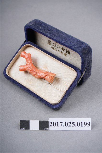 為珊瑚材質製成之裝飾品,以上下兩層可拆卸式盒子收納,上層盒子有「珊瑚美術品」、「基隆南珊瑚店」及「電話493號」等字樣。