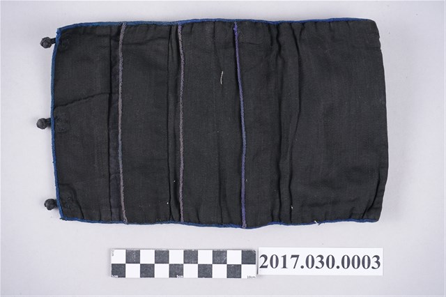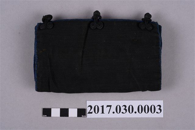 2. 本件為折疊式之客家褡褳袋,外形呈長方形,以黑色棉布縫製而成,內外無任何刺繡裝飾,開口處以3個盤扣與紐結作為開合。內層展開共有3個口袋,口袋邊緣以深藍色縫線滾邊略作裝飾。錢袋背面有3處小破損。