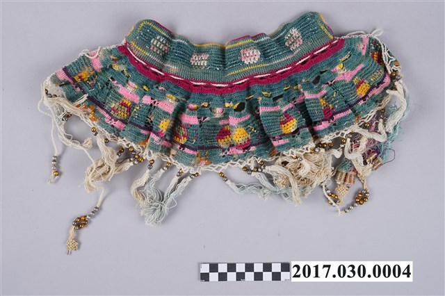 1. 本件為捐贈者林吳蘭玉的婆婆陳細妹女士(1895-?,苗栗頭份客家人)製作的嬰兒披肩。不同於客家傳統刺繡布片式的嬰兒雲肩,本件以綠、紅、黃、粉紅、白色等多彩色線鉤製而成類似一小斗篷的披肩。領子帶一小立領,胸前對開,左右襟各附有一條長流蘇綁帶。披肩本體為綠底裝飾多彩幾何圖紋,間以彩色塑膠珠與彩毬裝飾。披肩底緣垂墜綠色、白色、粉色之流蘇,營造華麗感。本件尺寸約20-30公分左右,十分迷你,推測為嬰兒服飾。