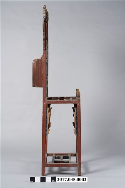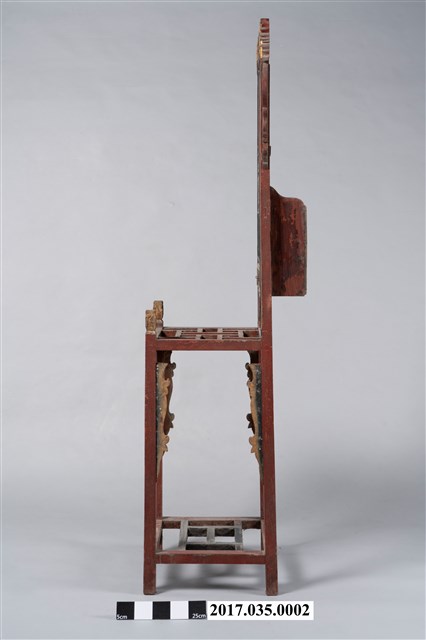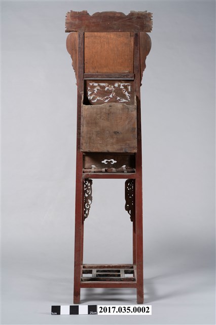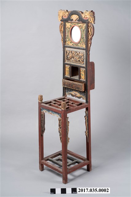 2. 洗臉架上以希臘羅馬式建築頂簷為架頭,其下為茄苳入石榴花草紋花框鑲鏡,照鏡左右輔以人物花草紋牙板裝飾,再其下為騎射人物堵、花草紋鏤空堵,最下為小抽屜,可放置肥皂等盥洗用小物。左右側兩側延伸出車枳柵欄型毛巾掛架。下半為方格形六足臉盆架座,支腳為方角轉形直腳,支腳近底部帶方格形底棖。整座洗臉架設計風格融合傳統漢體與少量和洋裝飾元素,通體施乾漆,並以府城特有之茄苳入石榴技法雕刻裝飾,造型典雅,推測為日本時代初期所製作使用。