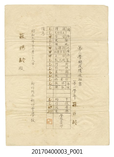 蘇百齡1921年生,新竹人。父蘇謙吉為什貨商,母蘇林氏足。四男,1928年就讀新竹公學校,1934年就讀新竹中學校,1940年就讀長崎醫科大學附屬藥學專門部,1942年畢業後就讀長崎醫科大學,1945年長崎遭受原子彈轟炸身亡。此為其就讀新竹州立新竹中學時的第1學年第2學期成績,學校寄送給蘇錫齡。課程有國語(日語)歷史、地理、外國語算術代數、幾何、理科、圖畫、音樂、作業科、體操,操行等資訊,最後有學級主任蓋印。