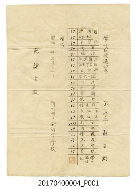 蘇百齡1921年生,新竹人。父蘇謙吉為什貨商,母蘇林氏足。四男,1928年就讀新竹公學校,1934年就讀新竹中學校,1940年就讀長崎醫科大學附屬藥學專門部,1942年畢業後就讀長崎醫科大學,1945年長崎遭受原子彈轟炸身亡。此為其就讀新竹州立新竹中學時的第1學年學年成績,學校寄送給蘇謙吉。課程有國語(日語)歷史、地理、外國語算術代數、幾何、理科、圖畫、音樂、作業科、體操,操行等資訊,此處學年成績使用分數方式呈現,並有及格與否之欄位,最後有學級主任蓋印。