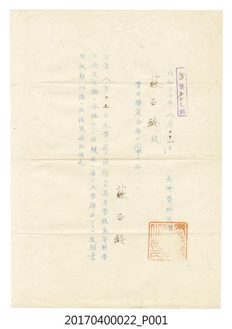 長崎醫科大學發給蘇百齡高等學校高等科學力檢定合格通知