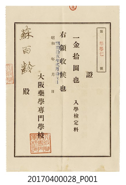 大阪藥學專門學校給蘇百齡入學檢定費10圓收據