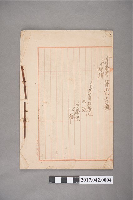 本件為陳崧波於分家後所持有之土地登記與典權相續等登記書,手寫抄錄,裝訂成冊,內容包括:(1)「第4號目錄陳崧波部分」陳崧波持有之土地登記清冊。(2)典主陳朝陽之典權由其子陳浚池、陳崧坤、陳崧江、陳崧波、陳崧滿等人繼承的大正3年(1914)「典權相續登記」與大正4年(1915)「典權持分相續登記」登記濟。(3)昭和19年10月18日(1944)陳崧波、陳怨購買新化郡善化街善化265、267、263-1、263-1第1號、264番地之登記濟。陳崧波所持分土地主要位於臺南新化郡善化庄北子(仔)店。