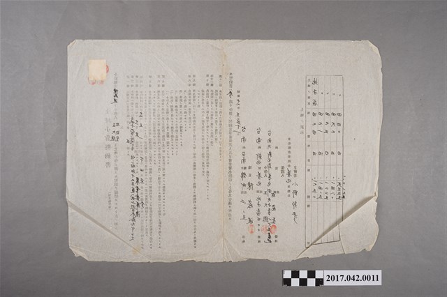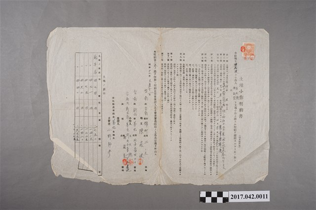 1.昭和17年5月31日陳崧波與王大總、林能奎立土地小作契約書,小作人王大總、林能奎租用地主陳崧波位於臺南州新化郡善化庄北子(仔)店地號474、471、473、462、440等5筆土地,面積1甲2分多,期限自昭和17年5月1日至昭和20年4月末日。 上貼有印花稅票。 2.地主:陳崧波,小作人:王大總、林能奎。保證人及立會者:新化郡農事組合善化支部長小野邦彥。