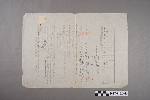 1.昭和17年5月1日陳崧波與劉澤立土地小作契約書,小作人劉澤租用地主陳崧波位於臺南州新化郡善化庄北子(仔)店地號230田地,面積6分5,期限自昭和17年5月1日至昭和20年4月末日。上貼有印花稅票。 2.地主:陳崧波,小作人:劉澤。保證人及立會者:新化郡農事組合善化支部長小野邦彥。