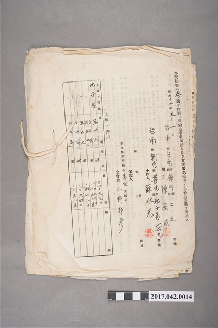 1.本件為昭和17-18年間地主陳崧波等將新化郡善化庄北子(仔)店田地租賃與佃農所簽訂之「土地小作契約書」,計有8份,裝訂成冊,保證人及立會者新化郡農事組合善化支部長小野邦彥。